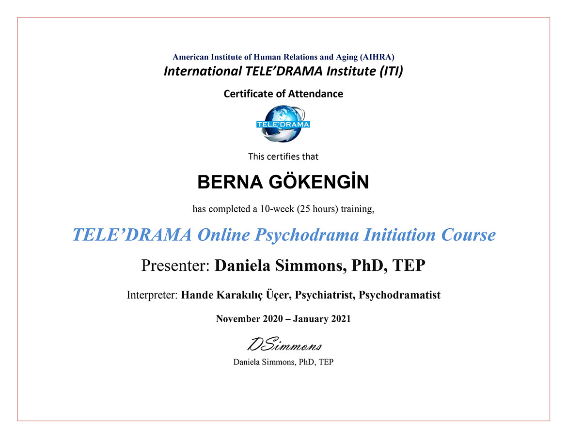 Psikodrama eğitimime 1998 yılında, “Dr. Abdülkadir Özbek Psikodrama Enstitüsü” çatısı altında, Doç. Dr. İnci Doğaner’in öğrencisi olarak başladım. Eğitimin ilk aşamasını 2003 yılında bitirerek Türkiye Psikoterapi ve Grup Terapileri Derneği “Psikodrama Asistanlığı” belgesini aldım. Psikodrama eğitimim sonlanırken 2006 yılında eğitim grubumda Doç. Dr. İnci Doğaner’in süpervizyonu ve tez danışmanlığı eşliğinde “Bir Grup Lise Öğrencisi ile Psikodrama Çalışması” başlıklı tezimi tamamladım. Bunun ardından yine 2006 yılı Mayıs ayında Türkiye Psikoterapi ve Grup Terapileri Derneğinin FEPTO onaylı (Avrupa Psikodrama Eğitim Organizasyonları Federasyonu) “Psikodrama Terapisti” belgemi aldım.